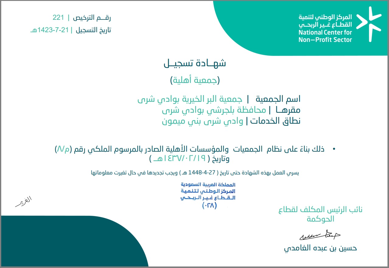 شهادة تسجيل جمعية البر الخيرية بوادي شرى